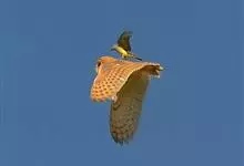 红隼:是隼科、隼属的小型猛禽之一。体重173-335克,体长305-360毫米。翅狭长而尖,尾亦较长,外形和共同爪隼非常相似。雄鸟头蓝灰色,背和翅上覆羽砖红色,具三角形黑斑;腰、尾上覆羽和尾羽蓝灰色,…全部>>