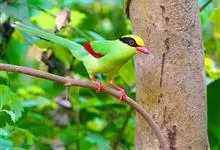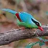 蓝绿鹊:中型鸟类,共有5个亚种。体长36-38厘米。尾长,嘴、脚红色。通体羽色主要为草绿色,宽阔的黑色贯眼纹向后延伸到后颈,在绿色的头侧极为醒目。两翅栗红色,内侧飞羽具黑色次端斑和白色尖端。尾绿色,…全部>>