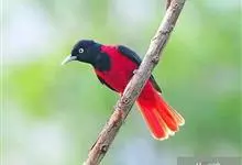 朱鹂:中等鸟类,体长23-28厘米。雄鸟绛紫红色,头、上胸及翼黑色。雌鸟上背及背部深灰色,尾覆羽及尾绛紫红色,腹部及下胸白而密布黑色纵纹。与鹊色鹂幼鸟的区别在上背灰色较深,下体白色较少且纵纹较粗。…全部>>