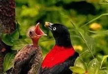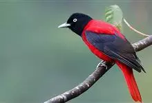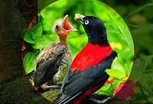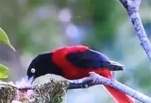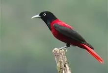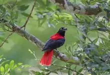 朱鹂:中等鸟类,体长23-28厘米。雄鸟绛紫红色,头、上胸及翼黑色。雌鸟上背及背部深灰色,尾覆羽及尾绛紫红色,腹部及下胸白而密布黑色纵纹。与鹊色鹂幼鸟的区别在上背灰色较深,下体白色较少且纵纹较粗。…全部>>