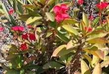 虎刺梅:别称铁海棠,是蔓生灌木植物。茎多分枝,长60-100厘米,直径5-10毫米,具纵棱,密生硬而尖的锥状刺,刺长1-1.5厘米,直径0.5-1.0 毫米,常呈3-5列排列于棱脊上,呈旋转。叶互生…全部>>