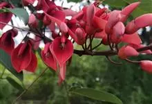 翅果刺桐 Merr.)是豆科,刺桐属乔木,高12-15米,具粗壮的刺。羽状复叶具3小叶,小叶膜质,卵状三角形,先端短渐尖,基部圆或宽楔形,两面无毛;总状花序长7-10厘米,有褐色绒毛;花红色,花萼钟状,…全部>>