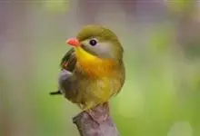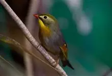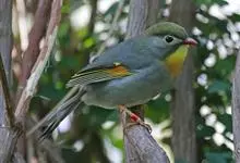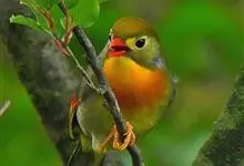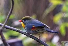 银耳相思鸟小型鸟类,体长14~18厘米。头顶黑色,耳羽银灰色,前额橙黄色;外侧飞羽橙黄色,基部朱红色,极为鲜艳、醒目。尾圆形,尾上、尾下覆羽朱红色,尾暗灰褐色,外侧尾羽橙黄色,其余上体橄榄绿或橄榄黄色。…全部>>