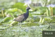 铜翅水雉雉鸻科铜翅水雉属的一种物种,是小型涉禽,体长28-31厘米。头颈、下体黑色,具金属色辉。从眼到颈有白色纵纹,背、内侧初级一飞羽橄榄铜绿色,尾下覆羽栗色。跗蹠的前后均有盾状鳞,趾、爪均甚长,…全部>>