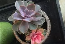 紫珍珠是景天科石莲花属的多年生肉质草本植物。植株中小型;叶片肉质,匙形,呈莲座状紧密排列;叶片粉紫色,叶缘呈粉白色,光照充足时颜色亮丽,不足时叶色会呈现深绿色或灰绿色,叶面光滑,被轻微白粉,…全部>>