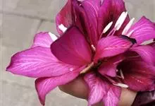 红花羊蹄甲,为豆科羊蹄甲属植物,别名艳紫荆、洋紫荆。半落叶乔木,高达了~10 m,叶草质,近圆形或阔心形,长8~13cm顶端开裂至全叶长1/4~13,裂片顶端圆。总状花序顶生或腋生,花冠紫红色,…全部>>