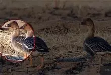 灰雁:体长70-90厘米,翼展147-182厘米,体重2.5-4千克,寿命17年。体大而肥胖。嘴、脚肉色,上体灰褐色,下体污白色,飞行时双翼拍打用力,振翅频率高。脖子较长。腿位于身体的中心支点,…全部>>
