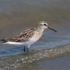 阔嘴鹬是涉禽,体长17厘米。特征为翼角常具明显的黑色块斑并具双眉纹。与黑腹滨鹬平滑下弯的嘴相比,阔嘴鹬的嘴具微小纽结,使其看似破裂。上体具灰褐色纵纹;下体白,胸具细纹;腰及尾的中心部位黑而两侧白。…全部>>