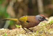 黑顶噪鹛:中型鸟类,体长24-26厘米。前额、脸、颏、喉黑色,头顶黑褐沾棕或深棕橄榄褐色,背栗褐或棕褐色,颧斑白色或棕红色,眼后缘和颈侧亦具白斑,飞羽金黄橄榄色而具蓝灰色尖端。下体淡棕褐色。…全部>>