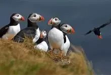 北极海鹦是海雀科的一种海鸟,体长26-38厘米,体重约490克。冠为黑色,脸颊灰色,腹部白色。喙大,为红黑色,腿为橙色,与其羽毛成为鲜明对比。冬天在海上蜕毛,失去一些鲜艳的脸部特征。成年雄性和雌性的…全部>>