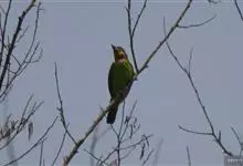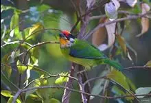 金喉拟啄木鸟,是须鴷科、拟啄木鸟属的鸟类。金喉拟啄木鸟为小型鸟类,体长19-24厘米。额深红色,头顶金黄色,后枕具一大块深红色斑,耳羽和头侧银灰色,上体草绿色,颏和上喉金黄色,下喉淡银灰色,…全部>>