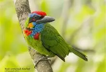 蓝喉拟啄木鸟,是须鴷科、拟啄木鸟属的鸟类。蓝喉拟啄木鸟为小型鸟类,体长20-23厘米。前额至头顶鲜红色,其上有一宽阔的黑色横带,将此红色分为前后二块;头侧、颏、喉蓝色,下喉两侧各具一红色点斑。…全部>>