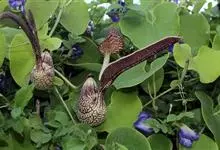 马兜铃是马兜铃科马兜铃属植物,根圆柱形;茎有腐肉味;叶卵状三角形、长圆状卵形或戟形,先端钝圆或短尖,基部心形;花单生或并生;花被筒基部球形,与子房连接处具关节,口部漏斗状,黄绿色,具紫斑,…全部>>