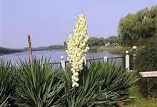 丝兰是天门冬科丝兰属植物。茎短或无茎;圆锥花序烛台状,花朵杯形,下垂,白色;叶基部呈剑形放射状,被白粉,革质;花期8—10月。丝兰原产于北美,在中国长江流域一带和华北地区均有栽培,长江以南地区也有分布。…全部>>