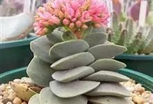 叶子表面宽厚,富肉质感且带有磨纱质感,看像石头质地;开红色小花,生于植株顶部,倒伞形密生,形状像花球一样。 全部>>