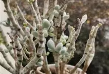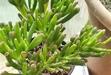 筒叶花月,是景天科青锁龙属的多年生草本植物。植株多分株,灌木状,茎较粗壮,圆柱形,表皮灰褐色;叶片肉质,互生,呈圆筒状,簇生于茎或分枝顶端,叶端呈斜截形,截面为椭圆形;花呈星状,淡白色;花期秋季。…全部>>