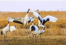 丹顶鹤:是鹤科、鹤属的一种大型涉禽,体长120-160厘米。颈、脚较长,通体大多白色,头顶鲜红色,喉和颈黑色,耳至头枕白色,脚黑色,站立时颈、尾部飞羽和脚黑色,头顶红色,…全部>>