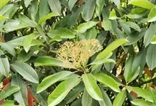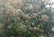 石楠 Kalkman),是蔷薇科石楠属的常绿乔木,高5~12米,株型紧凑,树冠圆球形。树枝为褐灰色;鳞片为褐色,没有毛;叶片革质,长椭圆至侧卵状椭圆形,有锯齿,新叶红色光亮。复伞房花序,白色小花,…全部>>