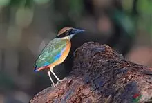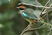 仙八色鸫是雀形目八色鸫科八色鸫属鸟类。雄鸟前额至枕部深栗色,有黑色中央冠纹,眉纹淡黄,背、肩及内侧飞羽辉绿色,飞羽黑色具白翼斑,颏黑褐、喉白,下体淡黄褐色、腹中及尾下覆羽朱红色。雌鸟羽色似雄鸟但较浅淡。…全部>>
