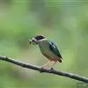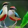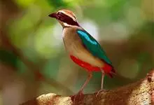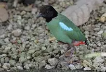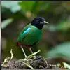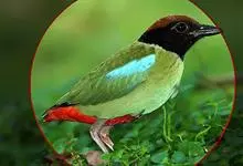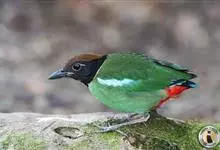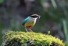 绿胸八色鸫:是雀形目八色鸫科的鸟类,共有12个亚种。体长为16-18厘米,体重65-69克。体型圆胖,尾短,腿长。头黑,上体绿色,两翼深色而具白色斑纹,头顶至后枕深褐,胸及腹部苹果绿,臀亮红。…全部>>