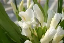 姜花又名野姜花。是姜科姜花属的多年生草本植物,茎高1-2米;叶片长圆状披针形或披针形,叶面光滑,叶背被短柔毛;穗状花序顶生,椭圆形,花芬芳,白色;蒴果卵状三棱形,微黄绿色;种子鲜红色,具橘红色的假种皮。…全部>>