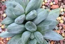 蓝黛莲是一种景天科厚叶草属植物。叶片呈略扁的圆柱形,排列成莲座状;颜色为灰绿色,表面覆盖的天然霜粉使其增添了些许灰蓝色的淡雅色调,阳光晒后叶尖变为红色。…全部>>