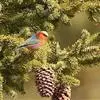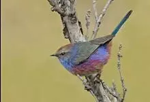凤头雀莺:小型鸟类。体长9-10厘米,雄鸟呈毛茸茸的紫色和绛紫色,顶冠淡紫灰色,额及凤头白色,尾全蓝。雌鸟喉及上胸白,至臀部渐变成淡紫色,耳羽灰,…全部>>