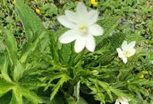 鹅掌草是毛莨科银莲花属的多年生草本植物。植株高40厘米;根茎近圆柱形;基生叶有长柄,叶草质,心状五角形,上面疏被毛,下面近无毛或被柔毛;花葶上部被柔毛,苞片呈菱状三角形或菱形,萼片为白色,…全部>>