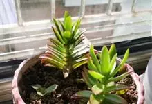 筒叶花月,是景天科青锁龙属的多年生草本植物。植株多分株,灌木状,茎较粗壮,圆柱形,表皮灰褐色;叶片肉质,互生,呈圆筒状,簇生于茎或分枝顶端,叶端呈斜截形,截面为椭圆形;花呈星状,淡白色;花期秋季。…全部>>