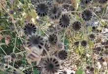 磨盘草 Sweet),又名:金花草、唐挡草。一年生成多年生、直立、分枝,亚灌木状草本,高0.5~2.5米,全部皆被灰色短柔毛。生于砂地、旷野或路旁。果为倒圆形似磨盘,直径约1.5厘米,黑色,…全部>>