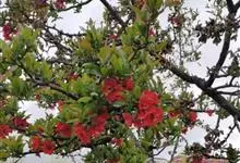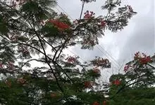 凤凰木 Raf.) ,别名火树、红花楹、凤凰花、火凤凰、金凤花、红楹,是豆科凤凰木属高大落叶乔木,树皮灰褐色,粗糙。二回偶数羽状复叶互生,矩圆形,两面均被柔毛。伞房式总状花序,花大,花瓣5枚,圆形,…全部>>