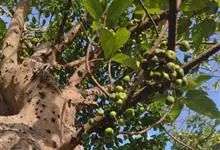 大果榕是桑科榕属的小乔木,株高可达10米;幼枝被柔毛;叶互生,宽卵状心形或近圆形;雄花无梗、匙形、花丝长,雌花生于雌株榕果内,子房白色;榕果簇生于树干基部或老茎短枝上、扁球形或陀螺形,…全部>>