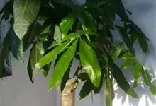 瓜栗 Walp. ),俗称发财树,木棉科小乔木,高4-5米,树冠较松散,幼枝栗褐色,无毛。小叶具短柄或近无柄。花单生枝顶叶腋;花梗粗壮,被黄色星状茸毛,脱落;萼杯状,近革质;花瓣淡黄绿色,狭披针形…全部>>