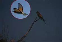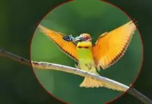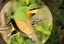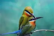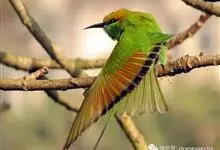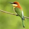 栗喉蜂虎是蜂虎科蜂虎属的鸟类。有热带鸟类羽毛艳丽的特征:喉部是栗红色的,黑色的过眼纹,翅膀和背部是绿色的,尾翼是蓝色的,飞行时翅膀下面的羽毛是橙黄色的,在阳光的照射下,它们全身闪烁着金属般的艳丽光泽,…全部>>