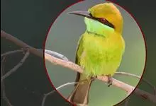黄喉蜂虎属中型鸟类,体长23-30厘米。喉黄色,其下有一窄的黑色胸带;胸带以下的整个下体蓝绿色。前额蓝白色,具一宽的黑色贯眼纹,头顶至后颈暗栗色,尾蓝绿色,中央尾羽延长,明显突出于其他尾羽。…全部>>