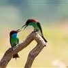 栗喉蜂虎是蜂虎科蜂虎属的鸟类。有热带鸟类羽毛艳丽的特征:喉部是栗红色的,黑色的过眼纹,翅膀和背部是绿色的,尾翼是蓝色的,飞行时翅膀下面的羽毛是橙黄色的,在阳光的照射下,它们全身闪烁着金属般的艳丽光泽,…全部>>