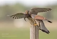 红隼:是隼科、隼属的小型猛禽之一。体重173-335克,体长305-360毫米。翅狭长而尖,尾亦较长,外形和共同爪隼非常相似。雄鸟头蓝灰色,背和翅上覆羽砖红色,具三角形黑斑;腰、尾上覆羽和尾羽蓝灰色,…全部>>