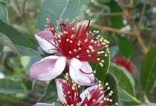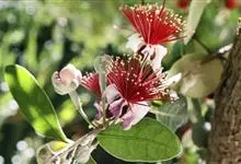 菲油果是桃金娘科、野凤榴属植物。常绿小乔木,高约5米;枝圆柱形,灰褐色。叶片革质,椭圆形或倒卵状椭圆形,长6-8.5厘米,宽3.4-3.7厘米。花直径2.5-5厘米;花瓣外面有灰白色绒毛,…全部>>
