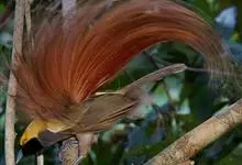 大极乐鸟是极乐鸟属中最大的鸟种。成年雄鸟体长可达到43厘米,雌性可达35厘米。雄鸟的额、颊、喉等墨绿色;头、颈黄色;上体暗赤栗色;腹部葡萄红色,胁部有长饰羽,其基部橙黄,中部黄色,…全部>>