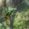 蓝须夜蜂虎是佛法僧目、蜂虎科的鸟类,体长约30厘米,是绿色林栖型蜂虎,蓝色的胸羽蓬松,嘴厚重而下弯。成鸟顶冠淡蓝,腹部棕黄带绿色纵纹。尾羽腹面黄褐。亚成鸟全身绿色。喉、胸部中央的羽甚长和亮色;该物种…全部>>