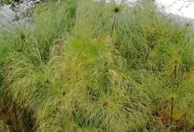 纸莎草是莎草科、莎草属的植物,具有粗壮的根状茎,高达2-3米,茎秆簇生,粗壮,直立,钝三棱形。叶退化呈鞘状,茎秆顶端着生总苞片,呈伞状簇生,总苞片叶状,披针形,顶生花序伞梗极多,细长下垂。瘦果灰褐色,…全部>>