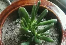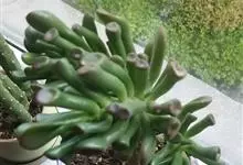 筒叶花月,是景天科青锁龙属的多年生草本植物。植株多分株,灌木状,茎较粗壮,圆柱形,表皮灰褐色;叶片肉质,互生,呈圆筒状,簇生于茎或分枝顶端,叶端呈斜截形,截面为椭圆形;花呈星状,淡白色;花期秋季。…全部>>
