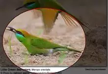 栗喉蜂虎是蜂虎科蜂虎属的鸟类。有热带鸟类羽毛艳丽的特征:喉部是栗红色的,黑色的过眼纹,翅膀和背部是绿色的,尾翼是蓝色的,飞行时翅膀下面的羽毛是橙黄色的,在阳光的照射下,它们全身闪烁着金属般的艳丽光泽,…全部>>