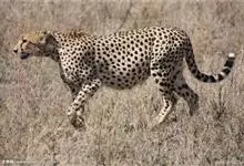 猎豹是食肉目猫科猎豹属哺乳动物,又称印度豹。胸腔深,腰细窄。粗糙的短毛为淡黄色,带黑色圆斑;腹部为白色,没有斑点,但尾巴有斑纹,到末梢共四到六圈黑色环纹。雄性比雌性大。寿命一般是6.9年。…全部>>
