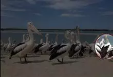 澳大利亚鹈鹕是一种大型涉禽,体重达13千克。生活于沿海及河川、湖泊等处。飞行力强而悠逸,常群飞群栖,极善于游泳,但不会潜水。游泳时张口捕鱼,将捕得的鱼兜入喉囊内。有时结群,排成长线,…全部>>