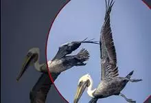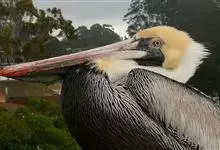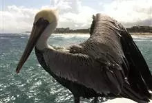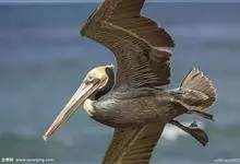 褐鹈鹕:是鹈鹕家族中体型最小的成员。体型粗大,体重6.5-9千克。嘴形宽大直长,上嘴尖端朝下弯曲,呈钩状;下嘴分左右二支,其间有一巨大而能扩缩的皮肤喉囊;鼻孔小,而位于嘴基。眼前部裸出。颈长而较细小…全部>>