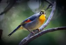 银耳相思鸟小型鸟类,体长14~18厘米。头顶黑色,耳羽银灰色,前额橙黄色;外侧飞羽橙黄色,基部朱红色,极为鲜艳、醒目。尾圆形,尾上、尾下覆羽朱红色,尾暗灰褐色,外侧尾羽橙黄色,其余上体橄榄绿或橄榄黄色。…全部>>