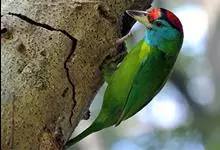 金喉拟啄木鸟,是须鴷科、拟啄木鸟属的鸟类。金喉拟啄木鸟为小型鸟类,体长19-24厘米。额深红色,头顶金黄色,后枕具一大块深红色斑,耳羽和头侧银灰色,上体草绿色,颏和上喉金黄色,下喉淡银灰色,…全部>>