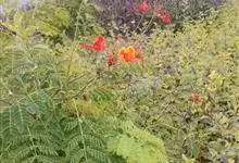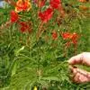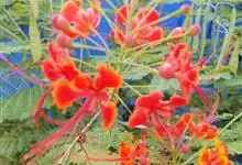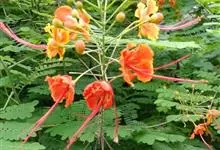 洋金凤 Sw.),豆科小凤花属灌木状或小乔木植物,枝无毛,绿或粉绿色;二回羽状复叶;总状花序伞房状,萼片无毛,花瓣橙红或黄色,圆形,花丝红色,子房无毛,花柱橙黄色;荚果窄而薄,…全部>>