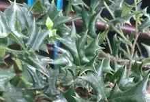 构骨叶冬青学名枸骨,又名猫儿刺、老虎刺、八角刺、鸟不宿、构骨、狗骨刺、猫儿香和老鼠树。常绿灌木或小乔木,高1-3米,二年枝褐色,三年生枝灰白色,叶片厚革质,花淡黄色,果球形,直径8-10毫米,成熟时…全部>>